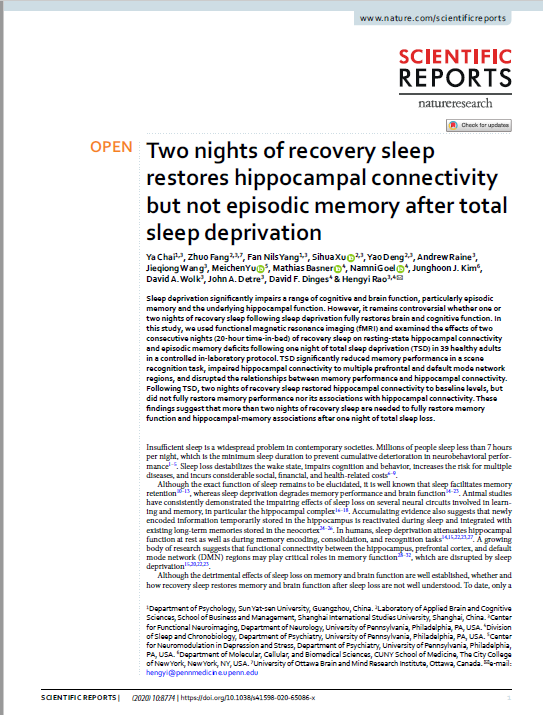 近日获悉,国际工商管理学院2018级工商管理系本科生邓尧作为共同作者在 Scientific Reports 发表题名为 “Two nights of recovery sleep restores hippocampal connectivity but not episodic memory after total sleep deprivation” 的文章。
