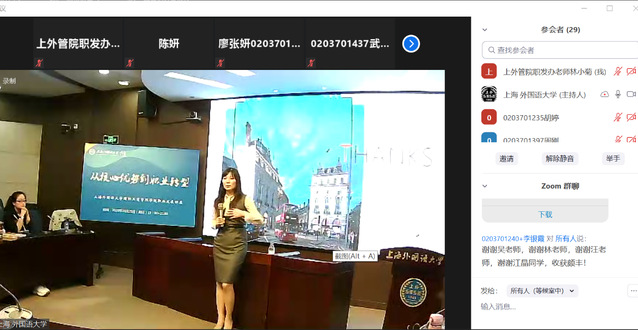 10月25日(周日)晚上,由上外管院职业发展办公室主办的,由法国液化空气(中国)投资有限公司大中华区域人力资源副总裁吴静博士主讲的“从核心优势到职业转型”的职业发展主题讲座顺利举办。考虑到疫情期间没能到校的同学参加讲座的需求,管院职发办克服场地和设备困难,第一次尝试了线下现场与线上直播结合的形式,使逾百名同学受益、同时聆听了此次讲座。