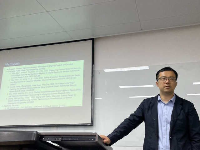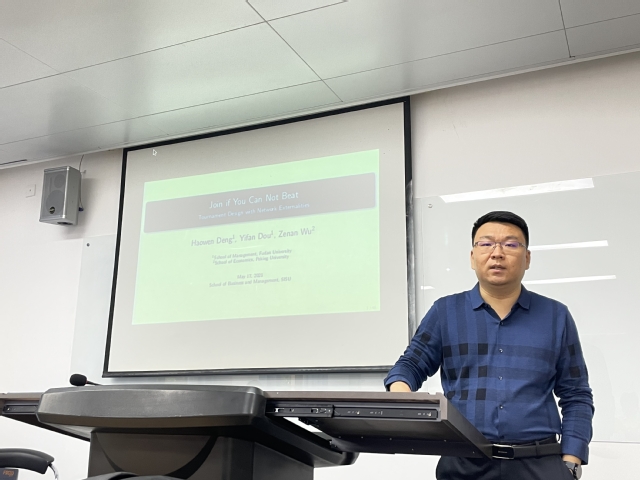 517日上午,上海外国语大学国际工商管理学院管院讲坛系列学术讲座62期在松江校区2235室顺利举办。此次邀请到了复旦大学管理学院信息管理与信息系统系窦一凡副教授做主题为《Join if You Can't Beat: Tournament Design in Online Games》的前沿讲座。我院副院长、信息管理与决策科学系主任马宝君教授主持讲座,全校青年学者以及博士生、硕士生及本科生近30人参加了此次讲座。