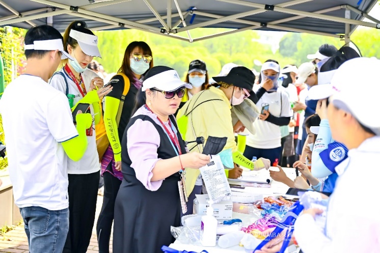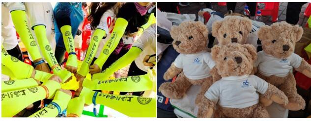 袁洁,上外管院2012MBA校友,在参赛现场给予学院很多帮助,包括领物资、赛事准备等;并联合其他几位校友一起赞助提供有上外LOGO订制版的冰袖和面巾,现场又继续赞助爱心小熊。