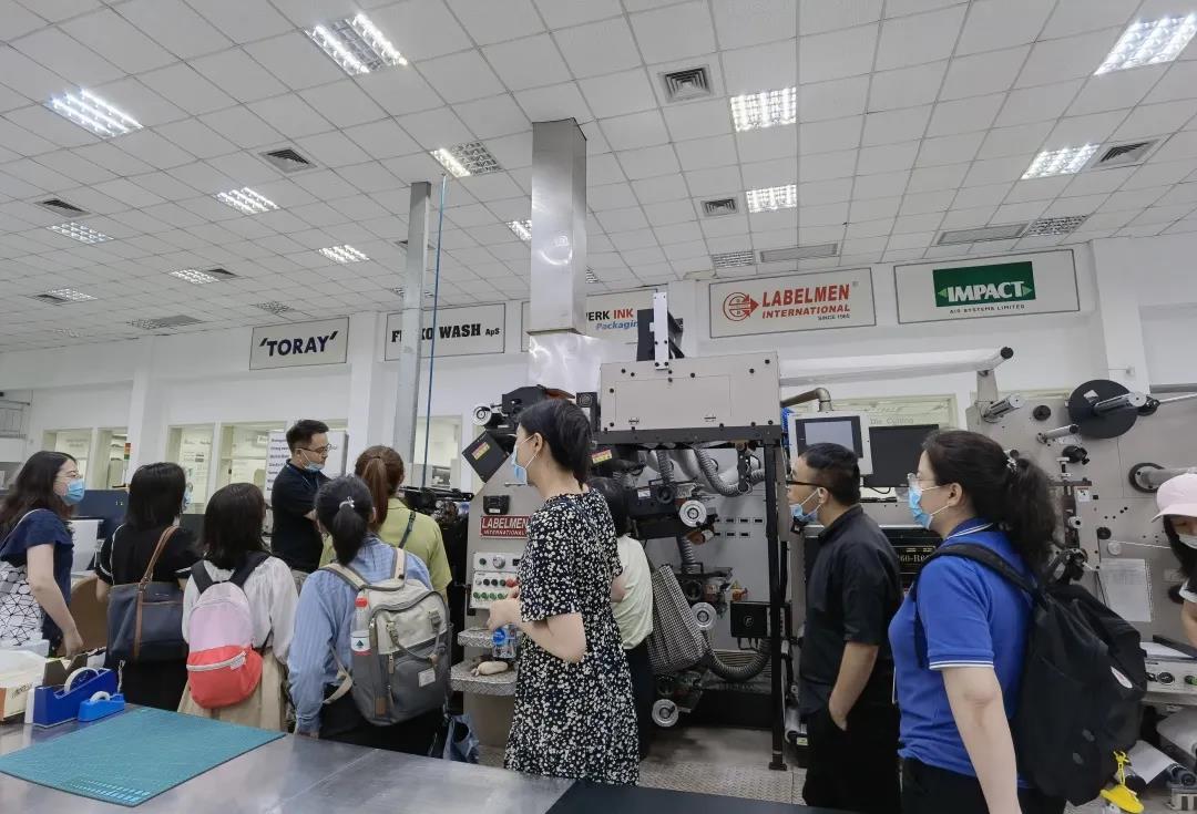 现场参观了标签涂布生产线、印刷学院和研发中心实验室。参观标签涂布生产线之前,大家都需要穿戴好安全防护衣具,工作人员分发耳麦,并观看安全宣导。领队们耐心地讲解标签涂布、分切的生产流程。其中,亚洲最先进的不干胶涂布线的涂布宽度达到2米,生产的过程高度自动化,对于精密度要求极高,给师生留下了深刻印象。