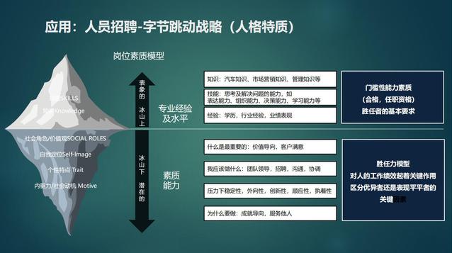 人才的冰山模型,是将人员个体素质的不同表现形式划分为表面的“冰山以上部分”和深藏的“冰山以下部分”。前者包括专业经验及水平,较易通过培训来改变,后者主要指素质能力、人格特质等,不太容易通过外界影响而得到改变,但却对人员的行为与表现起着关键性的作用。所以越来越多的企业人才队伍重视冰山以下指标的考量。以字节跳动为例,李俊老师指出其人才招聘特别注重人才“冰山”以下素质能力指标,将人格特质作为人才招聘的考量因素,重视聘用人员呈现的O+探险者特质特别是O3+创新人格特质。人们所看到的冰山表象的专业及经验水平为胜任者所需要的基本要求,而冰山下潜在的素质能力则是工作表现优异与否的关键。字节跳动在招聘、环境建设和人才协同方面不断发掘和激发员工的创新性,正是体现了其核心的企业发展理念“激发创造 丰富生活”。