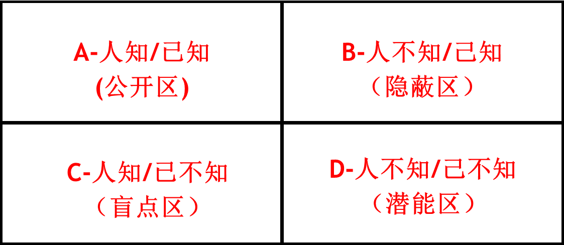 我们可以利用经典的约哈瑞窗口模型来理解对自我的认知程度。可以从二个维度—“自己知道与否”和“别人知道与否”来衡量自我认知的情况,分为四个区域: