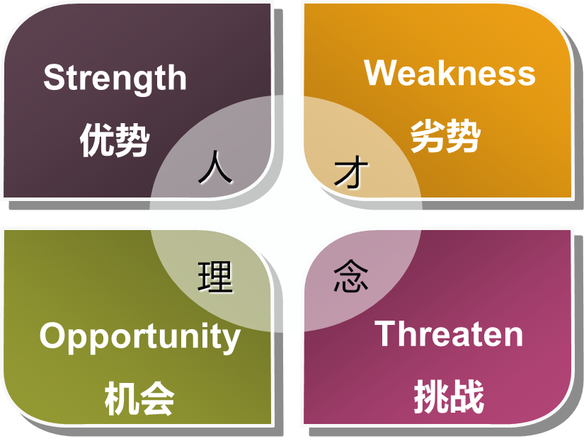 MBA同学经常使用SWOT分析模型对企业进行分析,以此为基础来改善提升企业的经营管理。大家也很有必要用此模型来进行自我分析,看一下自己有什么优势,有什么劣势,即将迎接什么机会,或者面对什么挑战。只有对自己有了更加深刻的认识,才能决定最适合的行业、企业和岗位,才能更自信、更顺畅地走好自己的人生路。