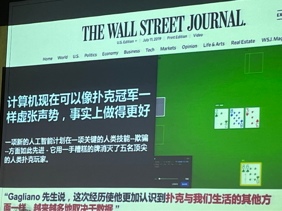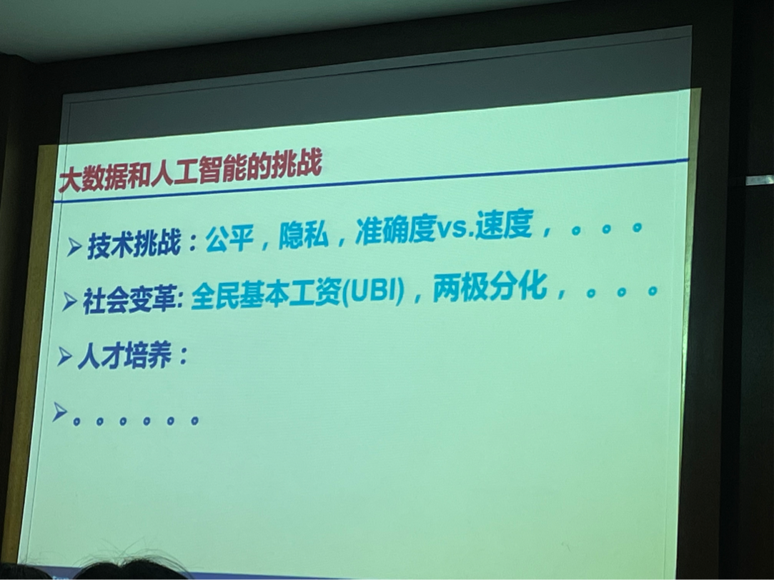 接下来,教授做出总结,世界处于百年未有之大变局,大国的竞争本质上是技术的竞争,人工智能是当前最核心的技术之一,它尚处在初级阶段,人才培养是当前最重要的任务,未来就是数据加算法加应用。