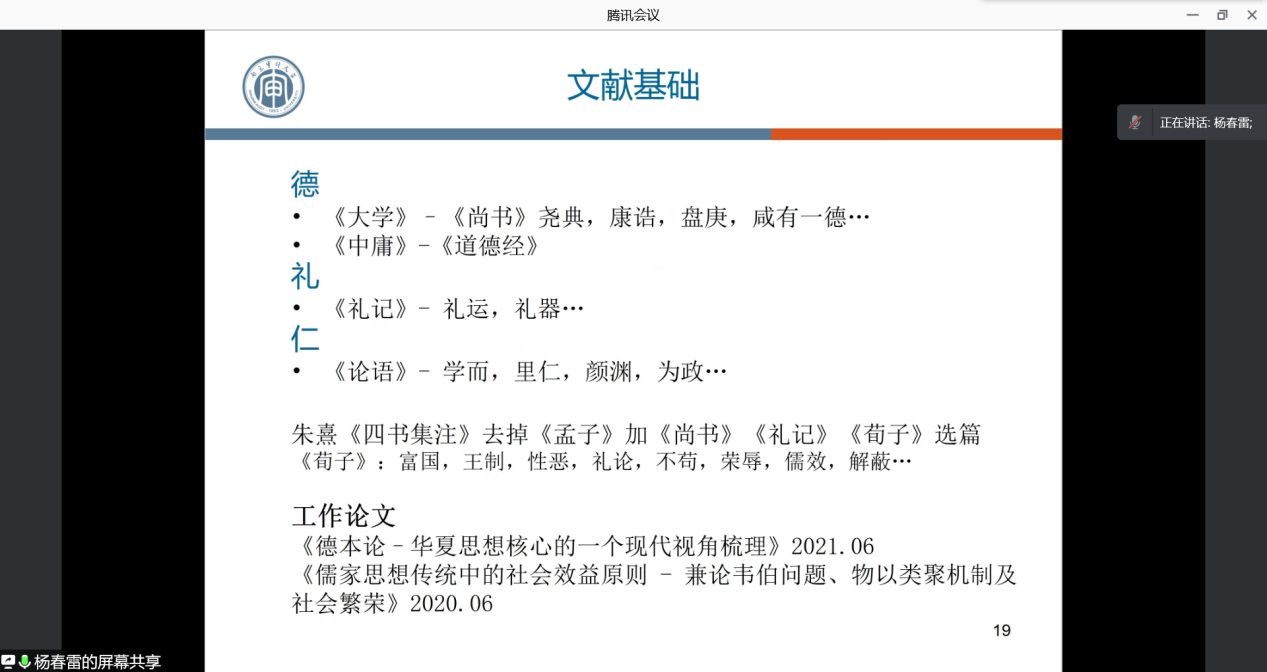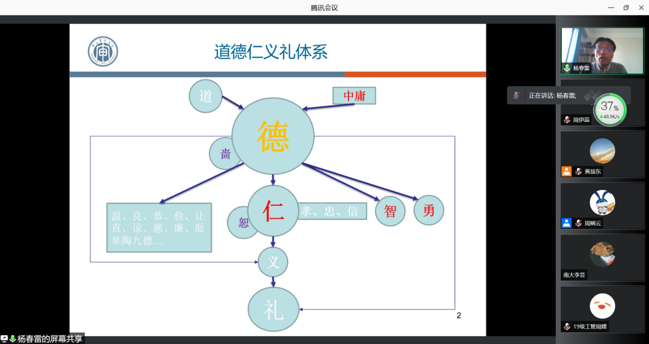 11月19日,上海外国语大学国际工商管理学院“管院讲坛系列学术讲座”第73期通过腾讯会议在线上顺利举办。应我院邀请,南京审计大学杨春雷教授为我院师生分享了主题为“德本论–华夏思想核心的一个现代视角梳理”的精彩讲座,杨晓兰教授主持了此次讲座。学院部分教授、教师、博士生、研究生及本科生参加了此次讲座。