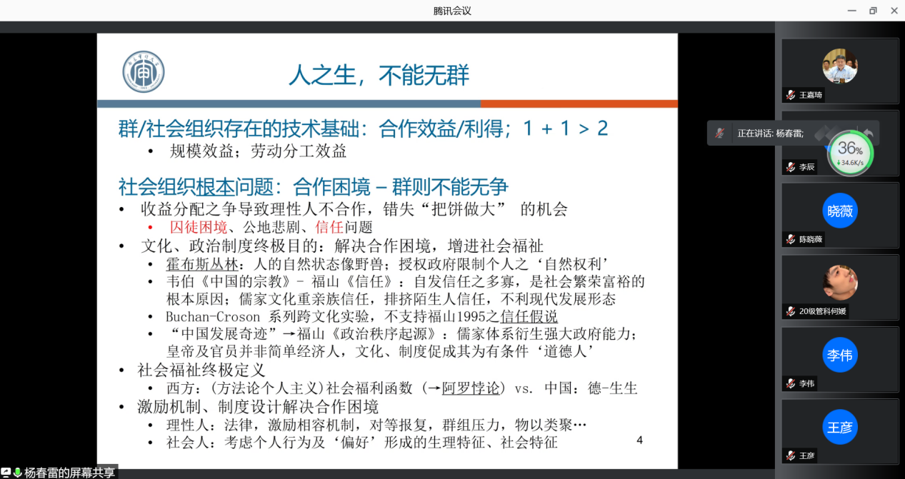 在本次讲座中,杨春雷教授首先说明了道德仁义礼是理解华夏思想传统的纲目,简要分析了道德仁义礼的体系,并提出了其核心是德,引出了德本论的主题。接着,杨春雷教授从何为德、功德银行、政治上的德治几个方面阐述了德本体系是一个内在一致、以社会结果为导向的、关于个人修身及社会治理的完整思想体系;民本是其治理原则必然申论;而个人德行的底线要求是先公后私。而后,杨教授讲述了礼、仁、义、中庸与德的关联,并指出,完美的德要求太高,礼、义是生产力发展、社会环境复杂化后,先秦哲人开发出来的局部优化子系统,以粗略逼近理想之德解;其内容及应用框架,先哲预设当与时俱进。仁,可以视为德之涉及社会人际互动的投影,孔子凝练出来用作礼义立目之纲领原则,其应用也是结果导向。道、中庸则是修德方法论。在生产力和社会网络爆炸式发展的当下,回归德本有助于有效内化华夏传统思想结晶,与世推移,执古之道以御今之有。最后,杨教授列举了文献基础和工作论文。整个讲座中,杨教授深入浅出,清晰详尽地为大家阐述了中国古代哲学理论思想在现代视角下的理解与现代经济学观点中的运用,主题新颖,使听众获益匪浅。
