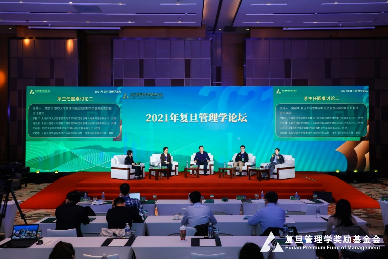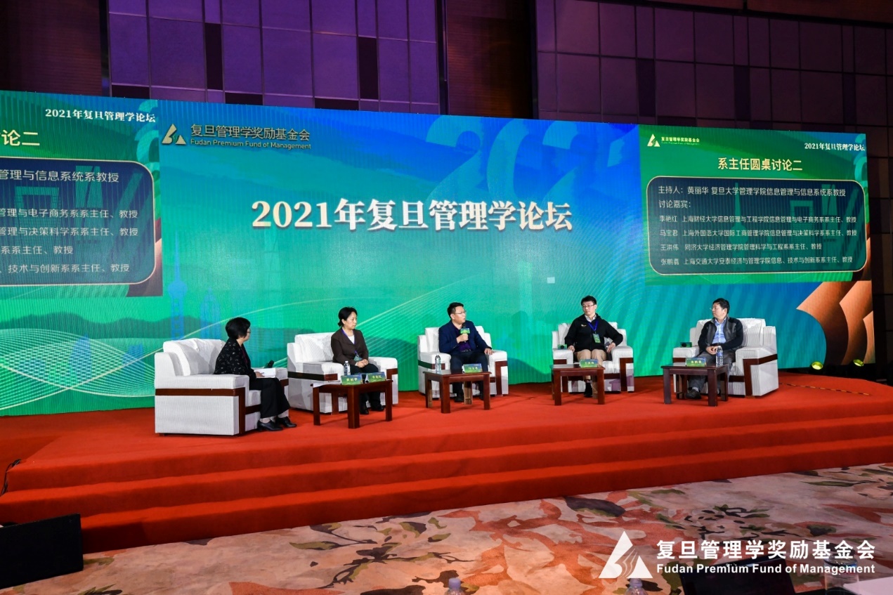 我院马宝君教授以信息管理与决策科学系主任身份,受邀参加该论坛的第2场系主任圆桌论坛,在复旦大学管理学院信息管理与信息系统系黄丽华教授的主持下,与上海财经大学信息管理与工程学院信息管理与电子商务系系主任李艳红教授、同济大学经济管理学院管理科学与工程系系主任王洪伟教授以及上海交通大学安泰经济与管理学院信息、技术与创新系系主任张鹏翥教授,共同探讨了信息管理和信息系统等专业当下面临的挑战,并分享了有效的应对措施以及其中蕴藏的机遇。大家认为,智能化时代要求商学院能够培养出既深谙信息技术应用、又懂管理之道的人才。要实现这一目标,我们还需在学术培养和师资建设上多下功夫。从学术培养角度来看,要跳出单一专业的局限,加强多学科交叉融合的力度;而在师资队伍的建设上,要让教师尤其是青年教师充分发挥自身在技术创新上的长处,促使教师们的成长走向“自觉、自动、自主”的良性循环道路。
