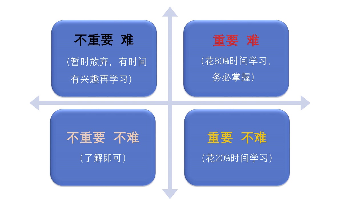 当然,很多同学学编程半途而废的原因是缺乏专业的师资,要么是软件开发人员担任教学任务,要么是大学老师自学之后任教。前者没有教学经验,拿学生当程序员一样培训;后者没有实战经验,只能照本宣科,依葫芦画瓢。我2018年第一次担任上财本科生金融科技教学任务时,也犯了前者错误,觉得自己讲得很清晰了,但是同学们还是觉得太难以理解了,对课程的评分也很低。从那以后我就吸取教训,把教学内容按难度和重要性分成了四个象限: