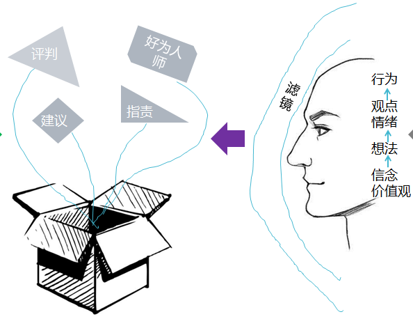 当我们在对话中采取沉默、争辩、反抗等行为时,当我们说出一些伤害他人的言语时,这些“行为”就是大脑的决策,决策的背后有着当不刻意觉察时难以发现的、瞬间完成的思考路径,这个路径就是我们的心智模式。心智模式里藏着前文所述的防御机制,它难以发现,但有迹可循,可以被分析和还原。简单来讲,我们从小到大的教育、环境、所见所闻、被灌输的各种理念知识,以及我们自带的基因等等,会形成底层的基本假设,也就是信念、价值观,它们会让我们在遇到事情/观点时产生主观的想法,想法会带着情绪与感受,表现出来的就是行为/言语。我们每个人的眼前都有着一层“滤镜”,滤镜形成每个人独特的看待世界的方式。当我们反推该路径,问问自己以下几个问题: