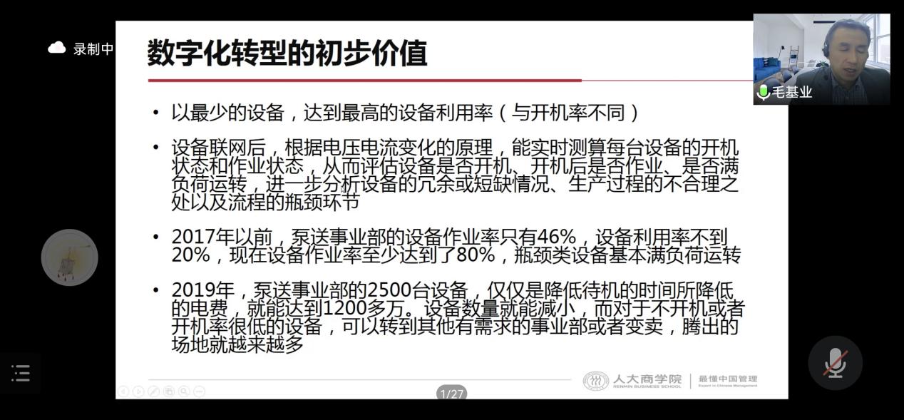 毛教授以第二个例子——三一重工的数字化转型为例,详细地讲述了三一重工在数字化转型之中做出的努力和尝试,得出结论:数字化转型,绝对是一把手工程。第一要素是一把手的决心。如果一把手不下决心,一把手没有排除万难的气魄,根本不可能实现数字化转型。并且在之后讨论了数字化转型遇到的难点和价值所在。初步价值在于:以最少的设备,达到最高的设备利用率;以最少的工人,实现最大的人均产值;通过精准、高效的视频跟踪,能够检查设备、人、工序的不合理之处;以最短的时间,优化最多的流程点。 三一重工的数字化转型是教科书级的案例。最后复盘一下数字化转型的关键成功因素,首先绝对是一把手工程,仅是支持是不够的,必须引领,还有大量的亲力亲为。数字化转型最根本、最关键、最难的是人的转型。始于学习,是长期持续的组织、人和文化的重构。