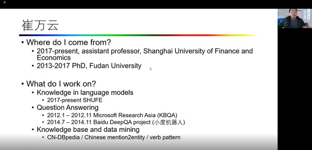 崔老师重点关注的其实是对于知识图谱未来的发展的思考——语言模型作知识库的问答。预训练语言模型可以提升KBQA,将问题表示模型替换为语言模型。在原有的问答系统的分类上加入了参数化组织源,使用预训练语言。预训练语言的知识表达在于将知识图谱的关系转化为自然语言模板,并且通过语言模型查询。预训练模型还可以在特定模型条件下取得与知识图谱相似的效果。其他的一些方式则是通过融合语言模型和知识图谱做知识来源。基于各类语言和模型的特点,老师通过假设例子,提出如何建立接近真实世界的模型的问题,实现实体化的建构。