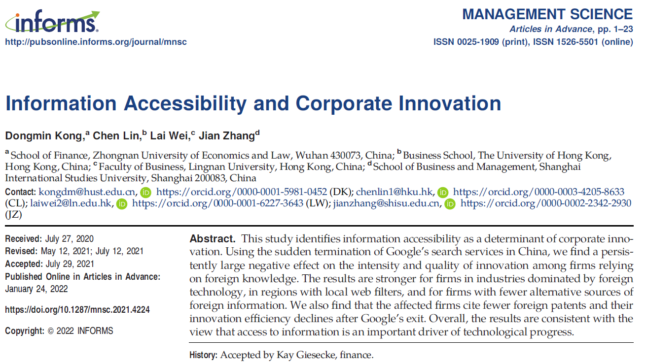 Dongmin Kong, Chen Lin, Lai Wei, Jian Zhang (2022) Information Accessibility and Corporate Innovation. Management Science Published online in Articles in Advance 24 Jan 2022. https://doi.org/10.1287/mnsc.2021.4224
