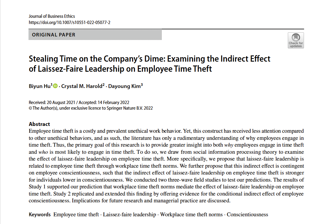 Hu, B., Harold, C. M., & Kim, D. (2022). Stealing Time on the Company’s Dime: Examining the Indirect Effect of Laissez-Faire Leadership on Employee Time Theft. Journal of Business Ethics. Advance online publication. https://doi.org/10.1007/s10551-022-05077-2