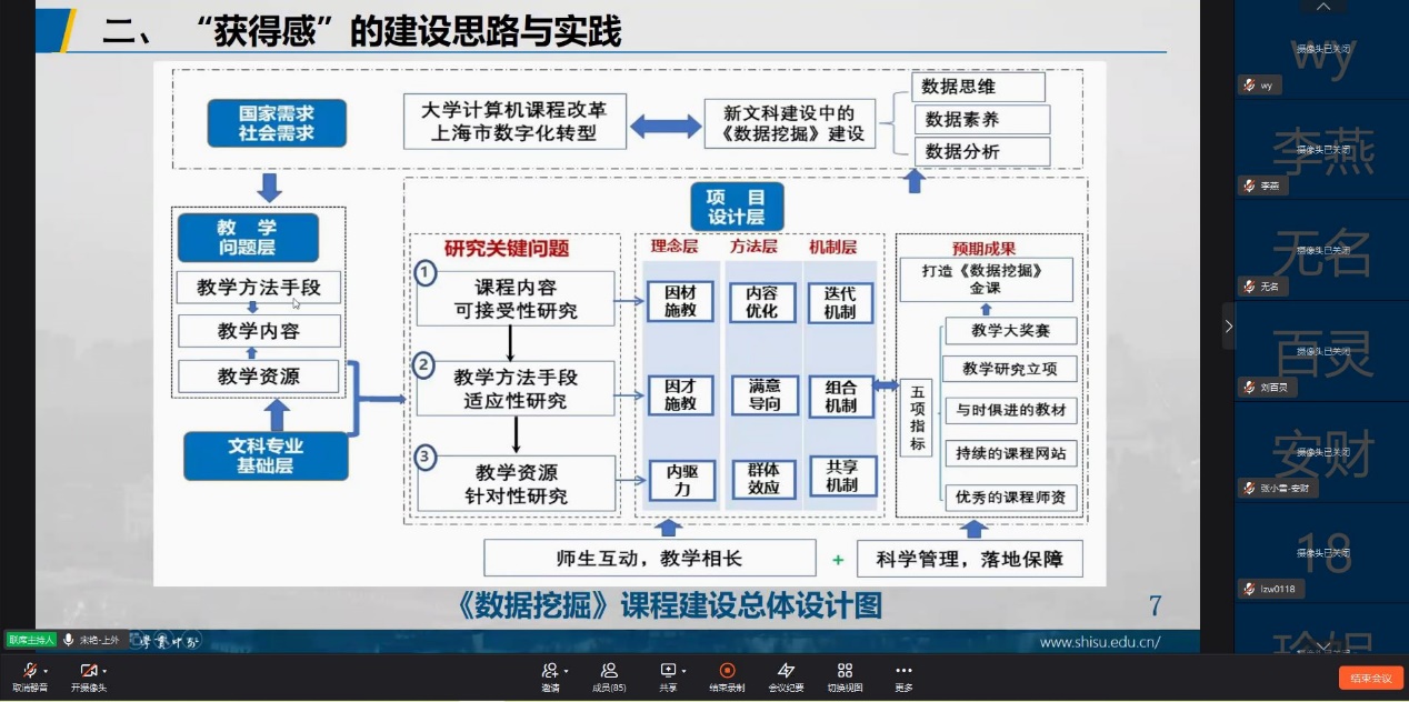 首先,宋艳教授介绍了《数据挖掘》课程在我院开设的历史沿革,结合我校文科学生多的背景,梳理了学生学习以《数据挖掘》课程为代表的数据分析类课程效果不佳的原因,并给出了针对课程内容可接受性、教学方法手段适应性和教学资源针对性三个维度的拟解决问题。接着,建立在“以学生为中心,教师‘教+导’的基础上”,宋艳教授具体介绍了针对该课程“获得感”的建设思路与实践手段,阐述了覆盖国家需求、社会需求、教学问题层、文科专业基础层以及项目设计层的课程建设总体设计思路,并以我院自主开发的“数据挖掘虚拟仿真实验平台”为例详细展示了在《数据挖掘》课程的教学设计、教学组织、教学方法、教学手段、资源建设等方面的做法和经验。