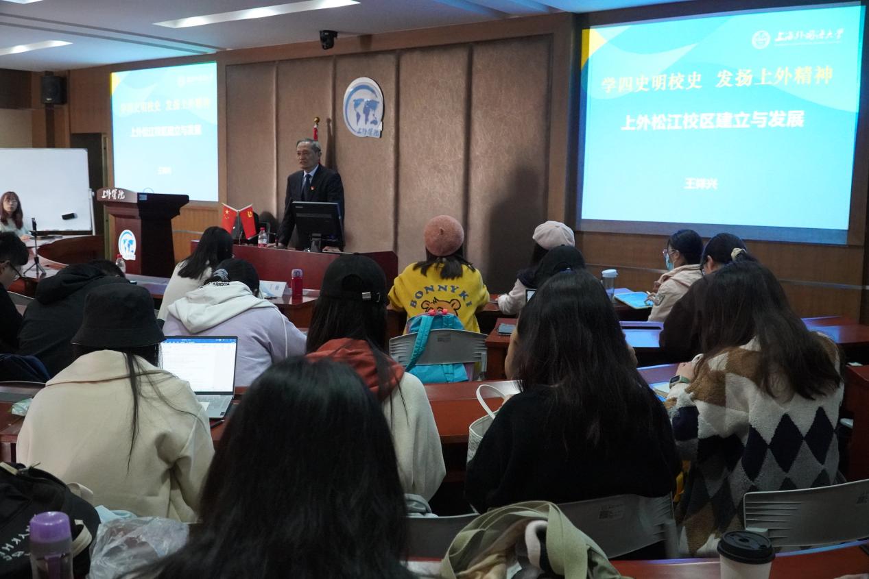 王祥兴教授分享的一幅幅珍贵的老照片勾勒出松江校区的发展轨迹,引导师生一同感受上外发展的艰辛历程。王祥兴教授提到,在新校区建立之初,虽然崭新的环境有助于学生们更好地投入学习和开展校园生活,但学校的管理问题还面临巨大挑战。然而,上外人迎难而上、开拓创新,提出了解决问题的八项举措,其主要聚焦在八个方面:抓好迎新教育、加强队伍建设、拓展素质教育、开展心理教育、帮困助学、开拓志愿服务、建设校园文化、落实就业工作。学校从多方位入手,有效解决了新校区发展过程中存在的问题,这正展现了上外服务国家发展、服务个人全面成长、服务社会进步、服务中外人文交流的办学使命,同时为推进上海高等教育改革与发展做出贡献,不断满足人民群众对高等教育日益增长的需求!