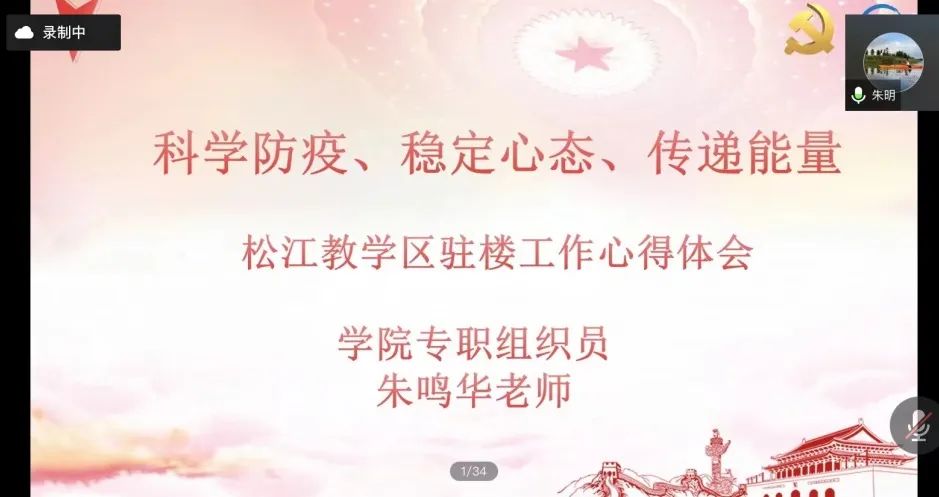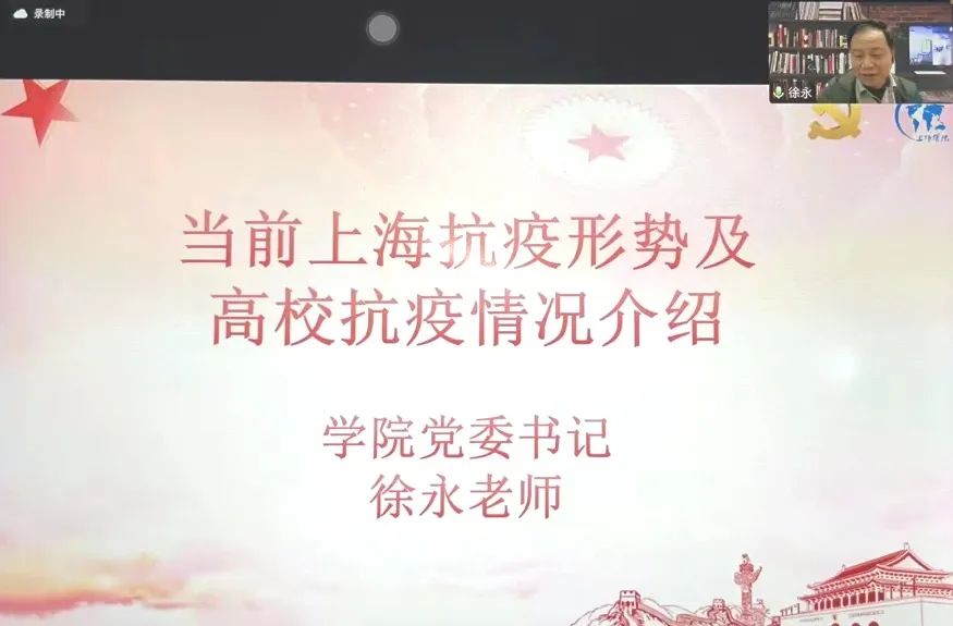 当下上海疫情形势严峻,全体师生必须以更坚决的态度、更彻底的措施、更迅速的行动力投身这场严肃的抗疫斗争!为了进一步把思想和行动统一到习近平总书记关于疫情防控工作重要批示精神上来,更好地推进抗疫工作,增强师生抗疫信心,我院积极响应上级号召,于4月6日晚面向全院学生党员和入党积极分子召开了学生党支部抗疫专题线上党课。学院党委书记徐永、党委副书记汪丽、专职组织员朱鸣华以及各年级辅导员参与活动,近300名学生线上聆听了4位驻楼党员教师的故事。