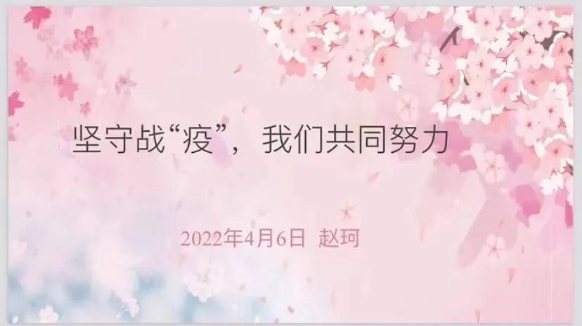 随后,学院研究生辅导员赵珂老师以“坚守战‘疫’,我们共同努力”为主题进行分享。六期公寓自3月11日起一直处于封闭管理的状态,作为六期公寓29号楼驻楼老师,她说道,”回忆这么多天驻楼的日子,我脑海里蹦出的第一个词就是‘我们’。没有我们在一起,没有共同努力的你我他,六期公寓不可能相对顺利度过这段封闭时光。”赵老师还分享了她的驻楼日记,介绍了驻楼工作从早到晚繁忙的一天,希望同学们能够理解并配合学校的防疫工作。接着,赵老师介绍并赞扬了29号楼学生和工作人员。学生志愿者们积极认真协助驻楼老师,共同为同学们做好服务保障,通过临时党支部、临时团支部陆续开展了各项丰富的活动。赵珂老师重点介绍了孔师傅,他坚持保障六期供餐、准时准点为师生配送一日三餐,用平凡的行动支持抗疫工作。最后,赵老师提醒最近网上信息纷繁杂乱,希望师生能够明辨信息,坚守自己的岗位,鼓励大家从积极角度多多发现生活的闪光点,处理好人际关系,磨练良好心态,坚信“坚持必定胜利,坚持才能胜利”,一起守“沪”。