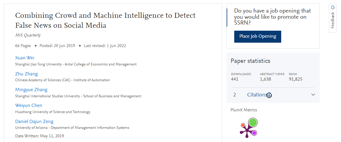 2. | Combining Crowd and Machine Intelligence to Detect False News in Social Media | MIS Quarterly | UTD24,信息系统领域顶级,SCI一区,影响因5.361 |