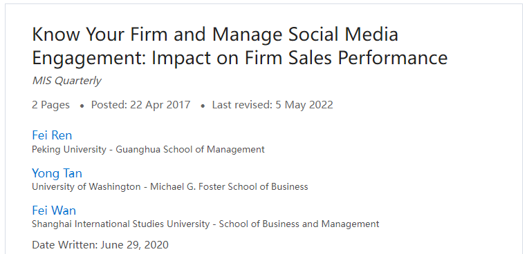 3. | Know Your Firm and Manage Social Media Engagement: Impact on Firm Sales Performance | MIS Quarterly | UTD24,信息系统领域顶级,SCI一区,影响因5.361 |