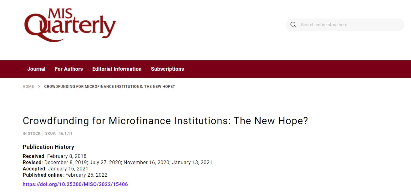 1. | Crowdfunding for Microfinance Institutions:The New Hope? | MIS Quarterly | UTD24,信息系统领域顶级,SCI一区,影响因5.361 |