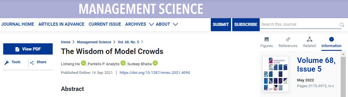 4. | The wisdom of model crowds | Management Science | UTD24,管理科学、运筹学领域顶级,SSCI/SCI一区,影响因子4.883 |