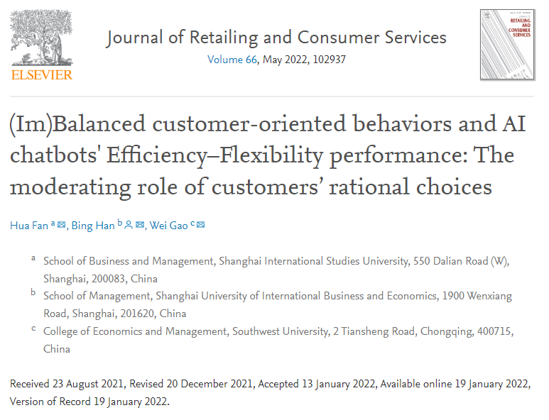 论文题目|  (Im)Balanced customer-oriented behaviors and AI chatbots' Efficiency-Flexibility performance: The moderating role of customers' rational choices