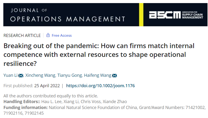 论文题目|  Breaking out of the pandemic: How can firms match internal competence with external resources to shape operational resilience?