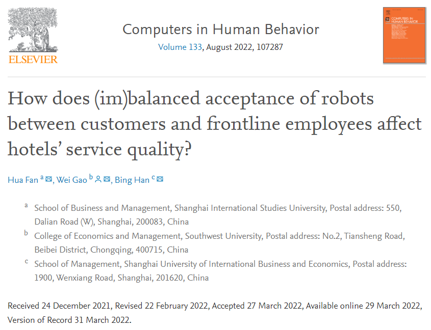 论文题目|  How Does (Im)Balanced Acceptance of Robots Between Customers and Frontline Employees Affect Hotels’ Service Quality?