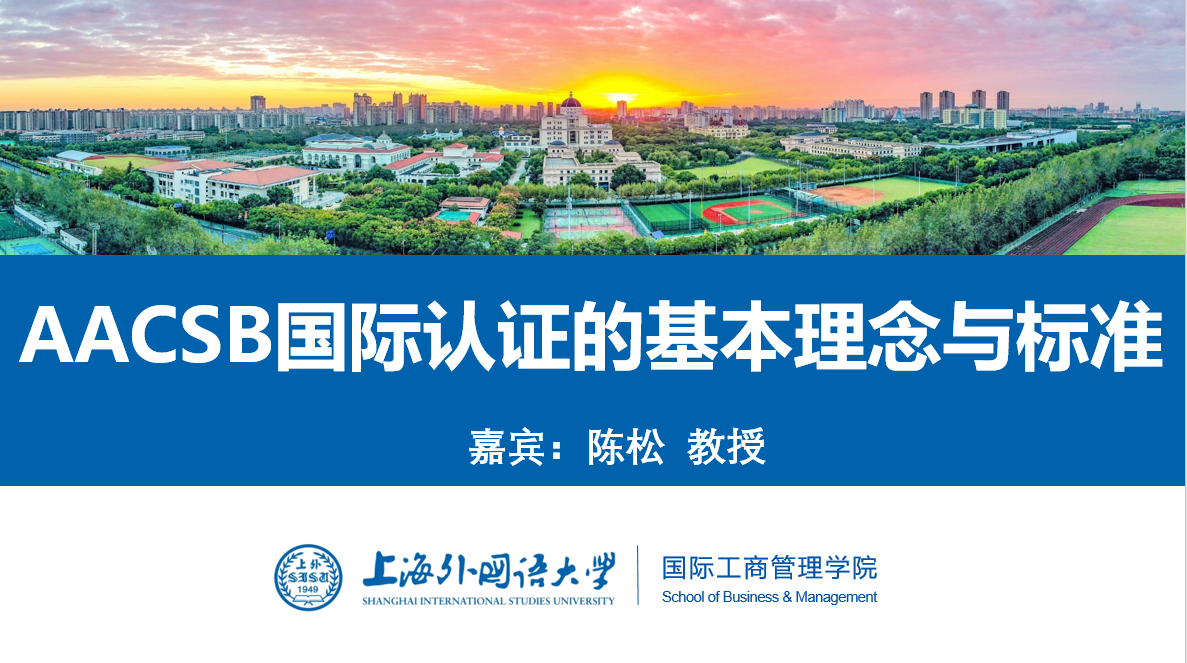 7月1日,为进一步推动AACSB国际认证工作,上海外国语大学国际工商管理学院邀请同济大学经济与管理学院陈松教授做云端培训和指导。我院潘煜院长携学院领导班子、系部主任、各教学项目负责人及AACSB认证工作组全体成员参加培训会。马宝君副院长主持了本次会议。
