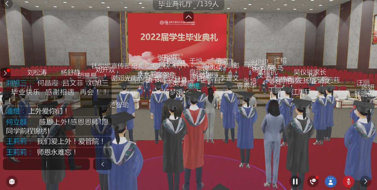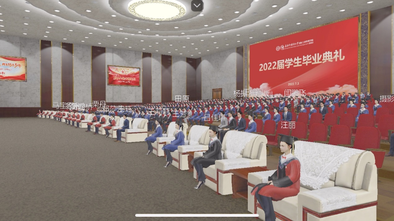 据国际工商管理学院院长潘煜教授介绍,这是中国第一批在元宇宙场景中被授予学位的学生。这届毕业生十分不易,四年之内,三年疫情,叠加学院培养方案迭代升级,学院本、硕、博及MBA各层次专业的培养硬核度大幅提升。毕业时特别想送他们一份独特的惊喜,这次举办元宇宙毕业典礼,也是学院与前沿同步的真实写照。送别时刻,借助科技的力量,深度链接师生心灵,把“人民至上,不负人民;大势将至,未来已来;不惧风雨,筑梦前行”的毕业寄语装入行囊,行走一生。