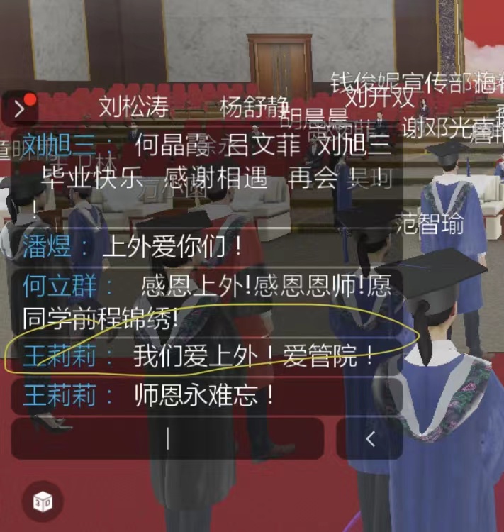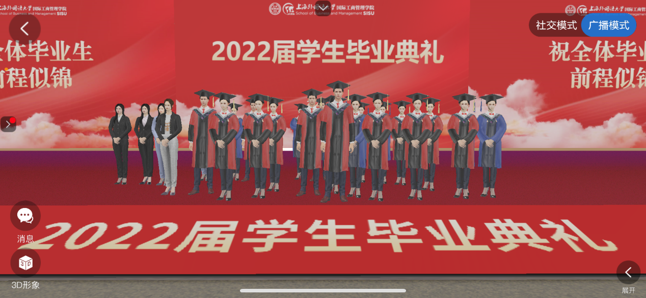 本次毕业典礼的亮点之一是在数字仿真会场中相对真实地还原线下毕业典礼。学院师生及观摩亲友团可以在云楼会议系统注册登录后,以真实的视角让自己的“数字分身”在仿真会场中参加典礼,全程体验毕业典礼流程及会场互动,尤其是颁证拨穗、拍照合影等沉浸式体验,让青春的记忆不留遗憾。上海市优秀毕业生吕佳琪告诉记者,当自己的“数字分身”参与到留言、鼓掌、点赞等互动环节中来,会场上与三百多人同频共振的代入感和虚实互补的体验感让她终身难忘。MBA毕业生代表王莉莉在典礼线上留言“我们爱上外!爱管院!”,欣喜和感恩之情溢于言表。典礼结束后,院长潘煜带领出席典礼的老师们走上前台与毕业生们合影留念。