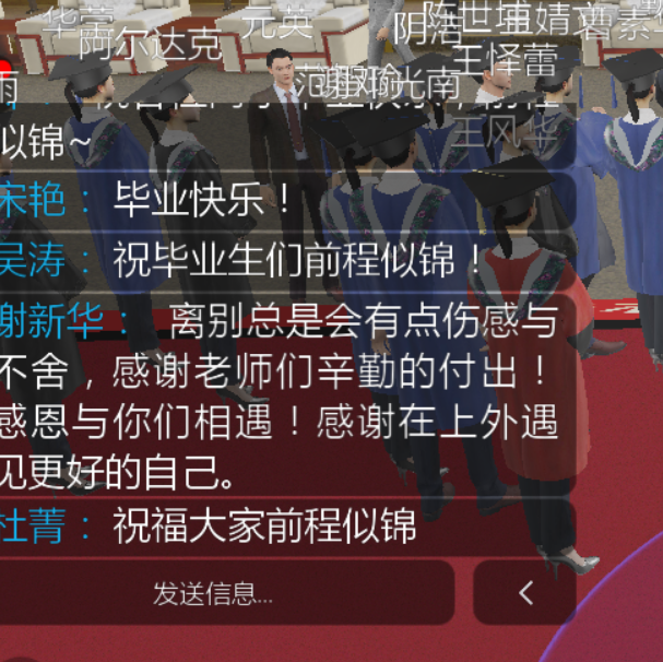赞助商北京移动微世界公司创始人王兴灿先生介绍说,近年来上外管院“国际接轨,前沿同步”的发展特色让他印象深刻。学院积极拥抱前沿科技,公司与学院合作一拍即合,双方紧密配合以超高强度在极短周期内挑战极限,完成具有自主知识产权的数字仿真毕业典礼系统开发,这与公司在行业内的深厚积淀是分不开的。公司后续将考虑与学院全面开展合作,开发空中课堂、数字仿真教研室、数字仿真实验室、数字仿真学术会议甚至是数字仿真校园招聘系统,让元宇宙技术全面赋能教育事业”。