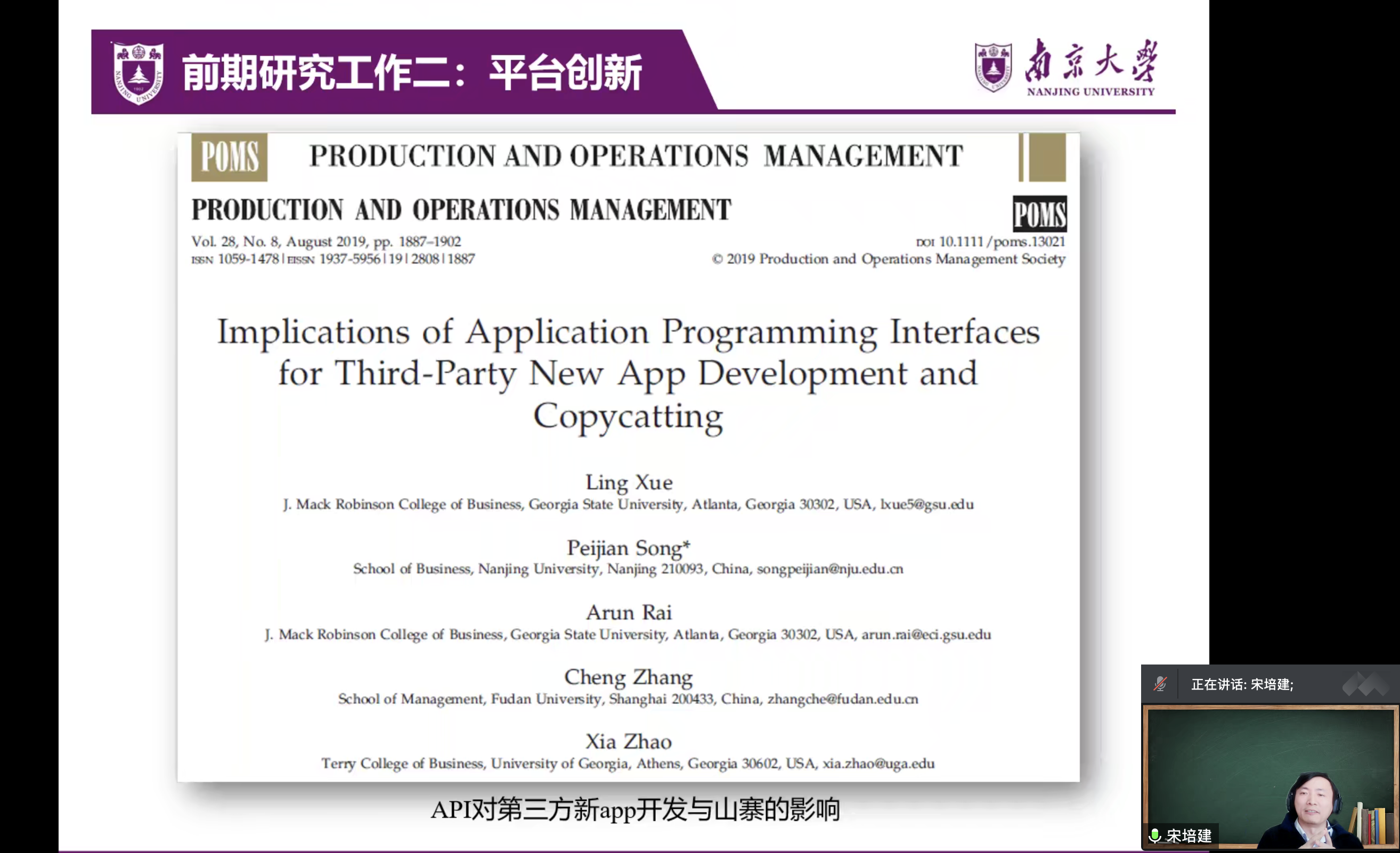 关于第二个研究,老师分享了有关平台API对第三方创新的影响的研究内容,并提出平台推出API能够有效促进第三方创新、减少其他平台的模仿现象。与此同时,通过对因果机制的进一步挖掘,发现API对创新和模仿的影响程度受到平台用户规模、竞争强度以及市场集中度三个变量的调节作用。