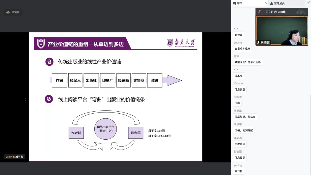 紧接着,宋老师提出平台系统是一个完整的生态系统,主要由终端用户(需求端)以及产品/服务供应商(供给端)两部分组成。过后,老师分别介绍了团队近年来从双边市场、创新生态系统以及平台治理三个视角开展的研究工作。