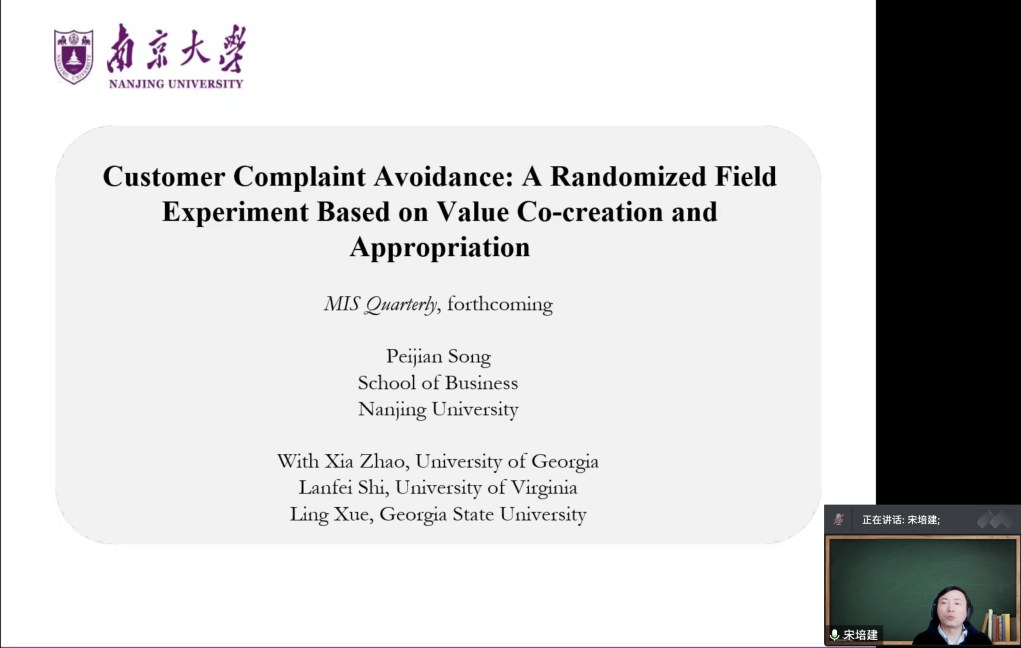 在最后一项研究中,宋老师向大家介绍了平台治理的基本方式,围绕“租房平台如何减少顾客投诉”这一研究问题阐述了研究的主要设计以及现场试验的基本开展流程,并强调了信息系统研究中“data”的重要性,倡议大家要发挥研究团队的优势,着眼于企业实际和生活实际,有针对性地开展研究。