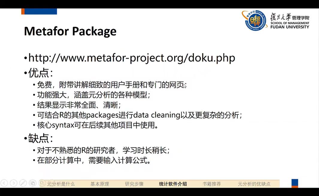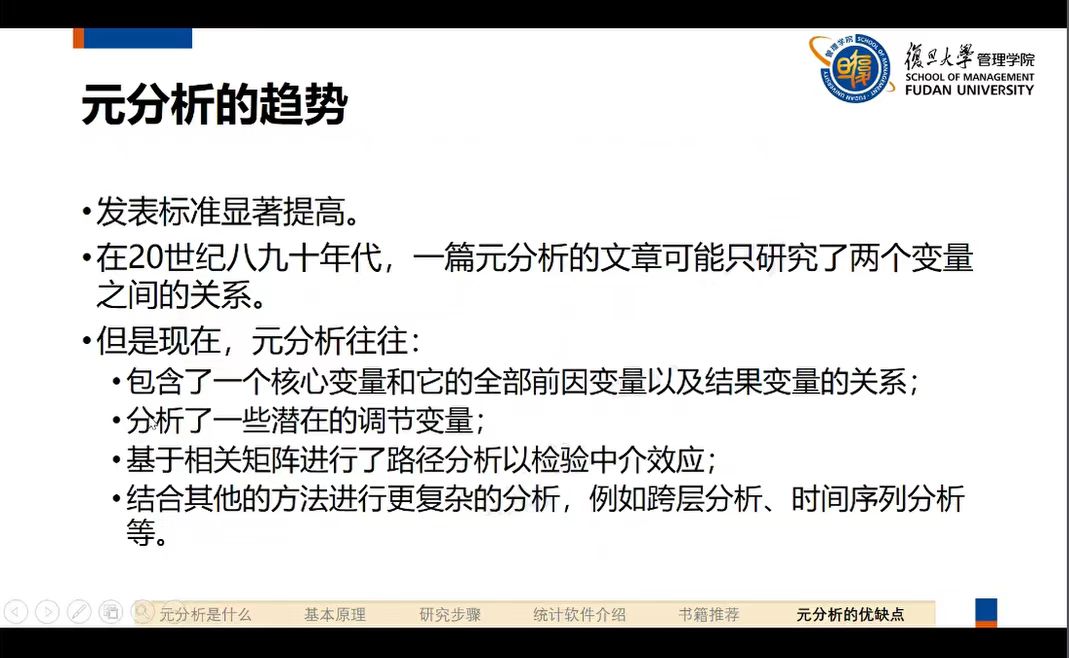 随后,吴老师对元分析常用统计软件进行介绍,如R’s metafor package、HLM、Excel等,着重推荐了R’s metafor package软件,结合自身经验比较得出其相对于其他软件灵活性强、功能强大等优点。另外,吴老师指出,了解、学习元分析可以通过阅读期刊、书籍文献的方法。作为总结,吴老师从理论和实践角度出发,剖析出元分析的优缺点,并对其发展趋势进行阐释,得出元分析的选题、研究难度逐渐提升的结论。