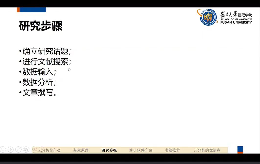 接着,吴老师提到元分析的五个研究步骤,即确立研究话题、进行文献搜索、数据输入、数据分析和文章撰写,强调在管理学领域的研究中,作为研究基础的第一步“研究话题选择”至关重要而且具有一定的难度,并对各步骤展开了具体的举例分析。