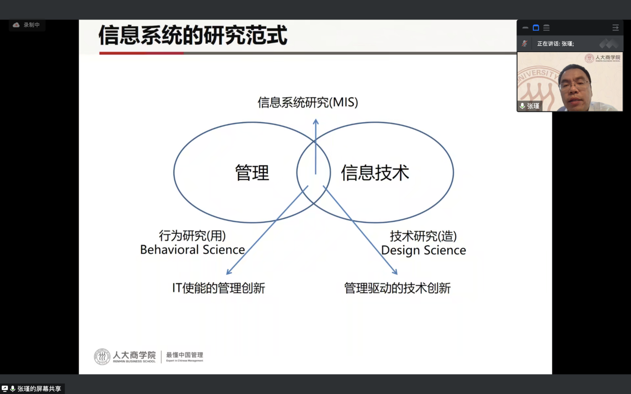 11月23日,上海外国语大学国际工商管理学院“研究生学术训练营”第6讲通过腾讯会议顺利在线上举办。应我院邀请,中国人民大学商学院张瑾副院长为我院师生分享了题为“信息管理研究中的设计科学与行为科学研究范式融合工作坊”的精彩讲座,我院信息管理与决策科学系慕遥老师主持了此次会议。来自上外管院及全国各个高校的老师、本科生、研究生、博士生参加了此次讲座,线上参会人数突破180人次。