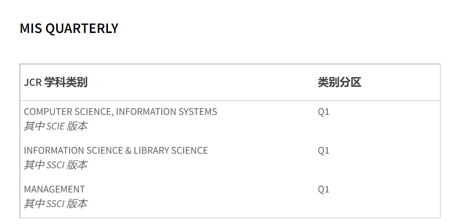 《MIS Quarterly》是信息管理领域排名第一的顶级期刊,具有较高的学术声誉。该期刊是美国德克萨斯大学达拉斯分校遴选的24本商学院顶级学术期刊(简称UTD 24)之一,也是金融时报评定出的50本商学院顶级期刊之一(简称FT 50)。