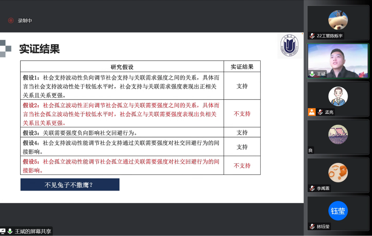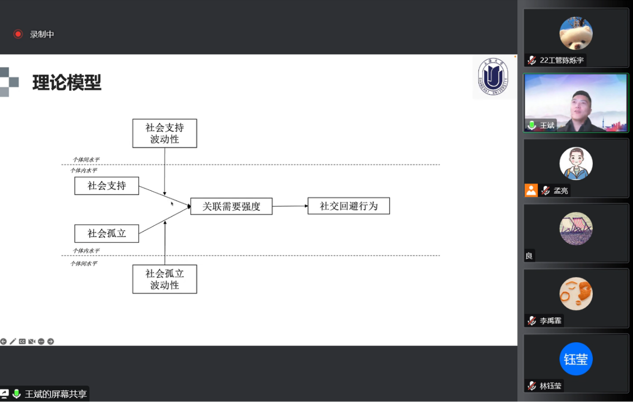 在分享过程中,老师和同学们积极提问,王老师就中介变量和结果变量问题进行进一步分析,并与提问人进行了热烈的讨论。主持人孟亮同样就社会孤立与关联需要强度展开提问,王老师热情耐心地回答了这些问题。