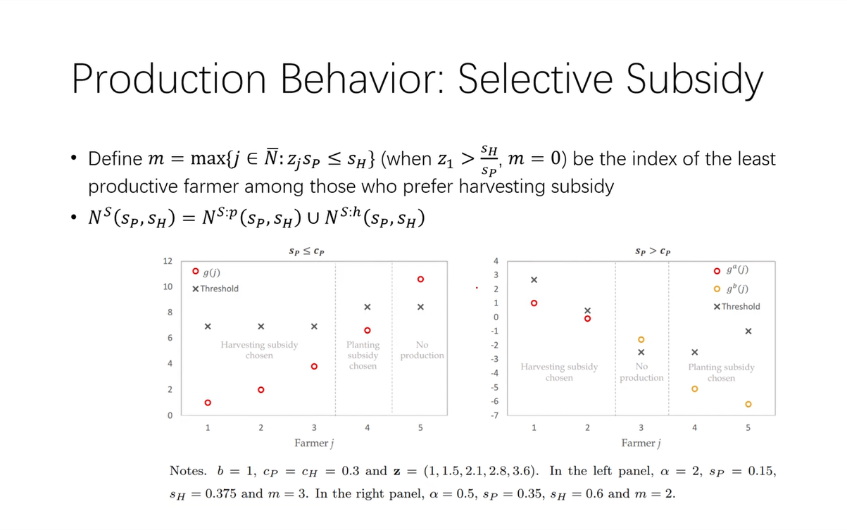 然后,吴老师阐述了政府对于两种补贴方式的问题及目标。又说明了最佳的综合补贴及选择性补贴,及在此政策下农民的生产情况,并将其和没有农业补贴的农民的生产情况作了对比。