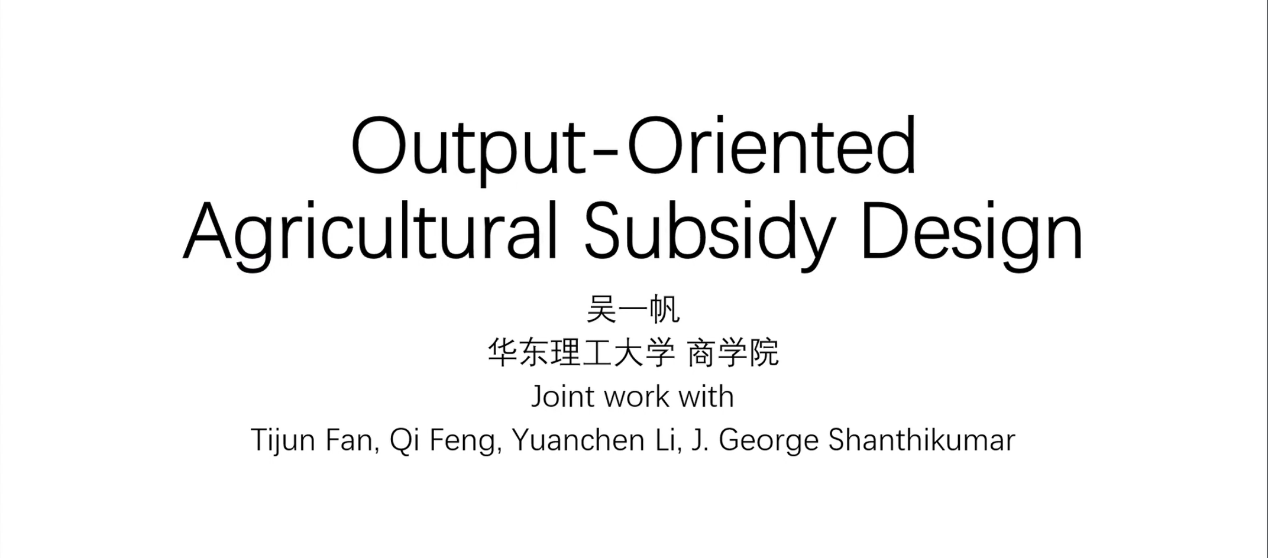 2022年12月15日,应我院邀请,华东理工大学商学院吴一帆副教授借助腾讯会议平台为我校师生分享了题为“Output-Oriented Agricultural Subsidy Design”的精彩讲座,陈靖副教授主持了此次讲座。学院部分教授、教师、博士生、研究生及本科生参加了此次讲座。