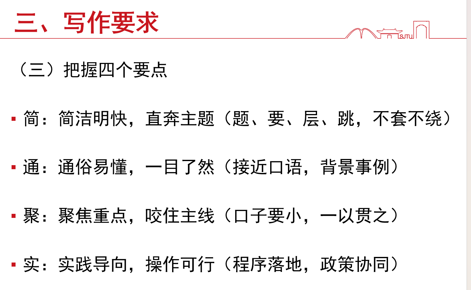 在写作要求方面,俞老师表示,处理好“需求与供应”“常识与专业”“时效与质量”等相互关系是写好一篇逻辑清晰的文章的必要条件。此外,在写作过程中需把握“简、通、聚、实”四个要点,要点清晰且观点意见具有实际可操作性,保证文章流畅自然、有理有据。在完成文章之后,还应对照主题筛选、价值评估、谋篇布局等指标对文章进行修改评估,进一步保证文章质量。