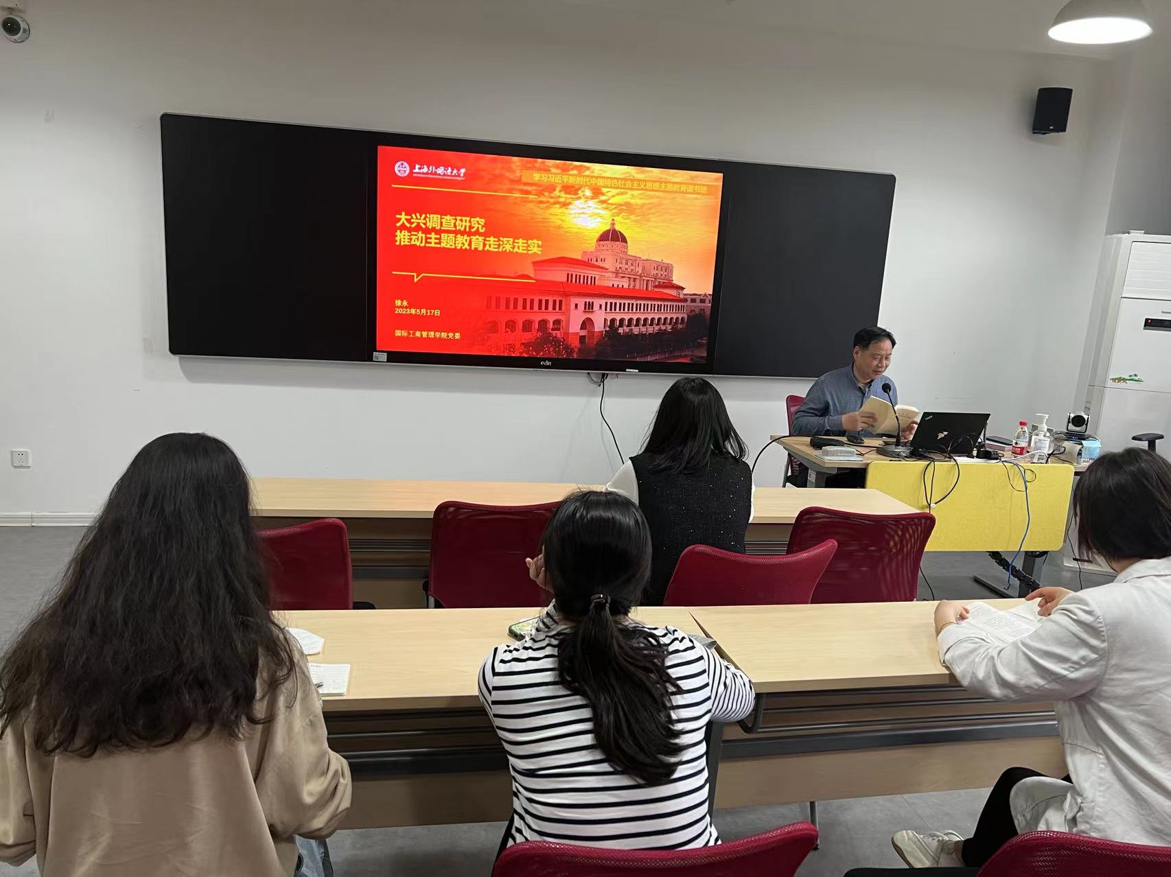 按照领导班子读书班计划安排,国际工商管理学院党委于5月11日下午举行了一场主题教育理论学习读书班,主题为“大兴调查研究之风,推动主题教育走深走实”。此次读书班由学院党委书记徐永领学,杨晓兰副院长和虹口校区行政老师参加学习,松江校区部分行政老师则通过线上方式进行学习。