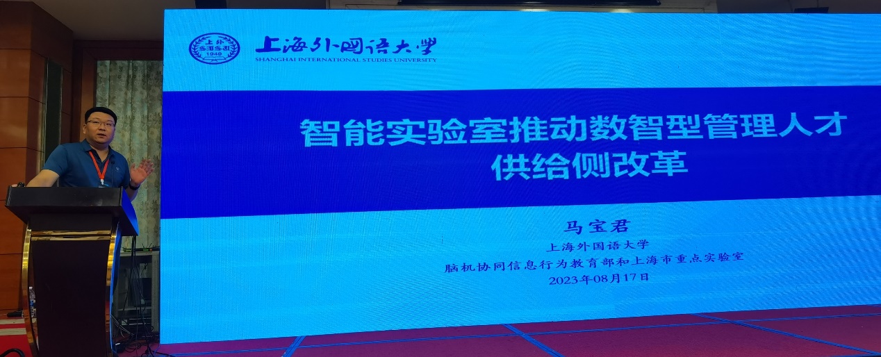 接着上海外国语大学马宝君教授做了题为“智能实验室推动数智型管理人才供给侧改革”的报告分享。马宝君教授首先介绍了当前世界顶级商学院在数据科学和智能科学领域的前瞻布局,指出数智型人才的培养是中国管理类人才的供给侧改革;接着以上海外国语大学国际工商管理学院为例,基于脑机协同信息行为省部级重点实验室平台,从本硕博后贯通式培养体系、本科“数智型管理2.0版”培养方案设计、学术启航计划及人工智能系列训练营、虚拟教研室建设等方面分享了人才培养及专业建设改革举措;最后重点介绍了脑机协同信息行为省部级重点实验室平台建设及相关成果情况。
