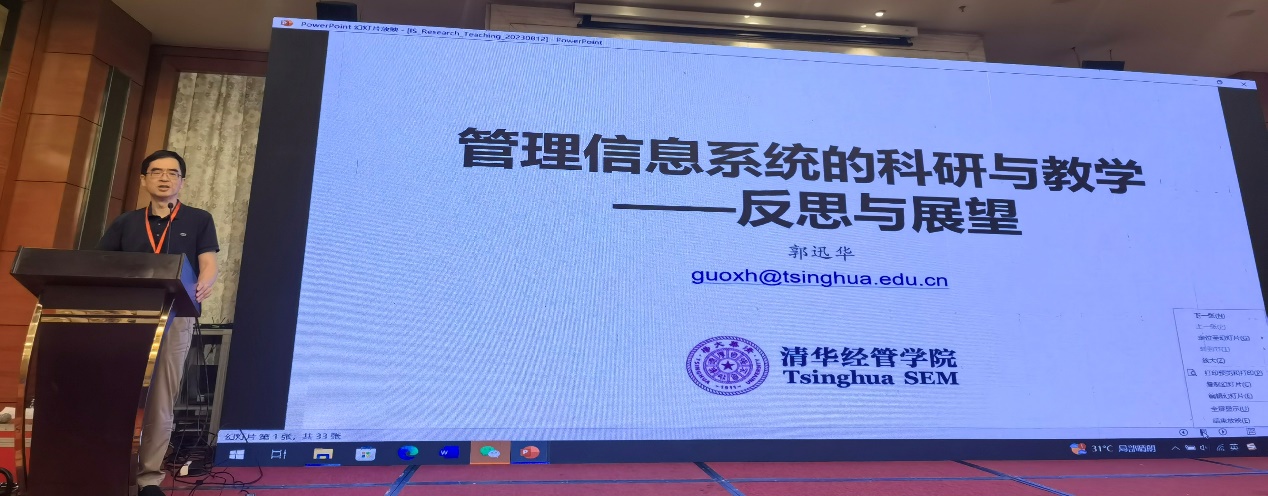 16日上午的第二场分享是由清华大学郭迅华教授带来的题为“管理信息系统的科研与教学——反思与展望”的报告。郭迅华教授首先基于 “数智化”新跃迁背景,梳理了信息系统学科目前在科研、教学与人才培养方面面临的机遇与挑战;接着分析了信息系统从“自动化/集成化”到“智能化/人机协同”的焦点演化,我国信息系统学科的研究范式从“注重严谨性”向“严谨性与相关性并重”转变,从使用“主流方法论”到“多样化研究方法”转变,中国情境/中国影响力也从“模仿学习”向“创新提升”转变,我国的信管专业的人才培养从注重“应用开发技能+管理知识”向关注“大数据分析能力+数智思维”转变;郭教授还提出了教学、科研、产业实践三方协同促进思路和举措,并介绍了清华大学信管专业近年来在课程内容与结构、学术引导、实践引导等方面的改革探索举措。