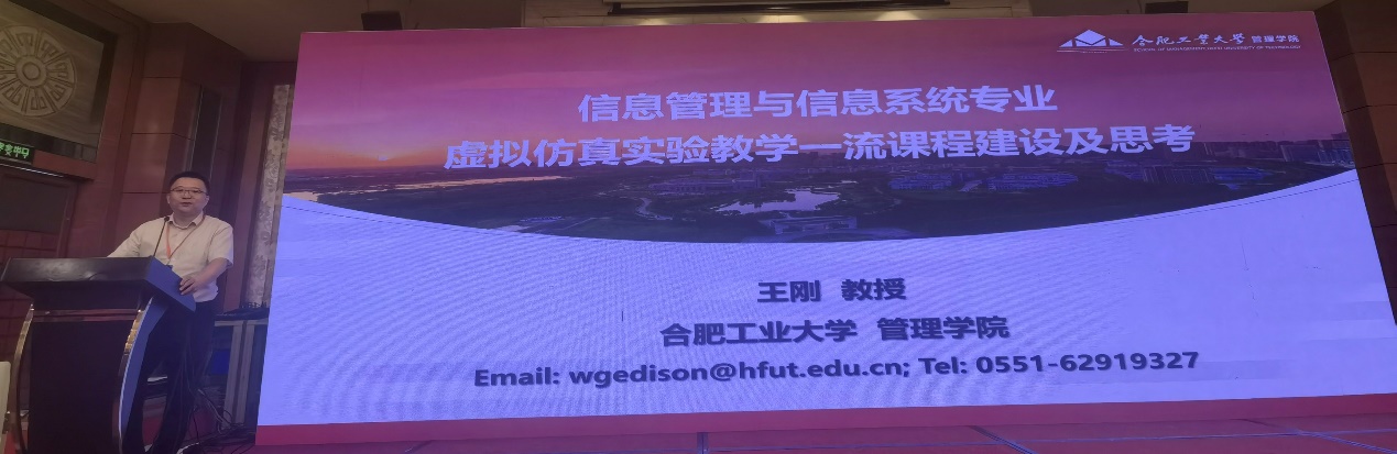 研讨会的最后一场报告是由合肥工业大学王刚教授做的题为“信息管理与信息系统专业虚拟仿真实验教学一流课程建设及思考”的分享。王刚教授在介绍合肥工业大学信管专业的基础上,梳理了对信管专业虚拟仿真实验教学的理解和思考,接着详细介绍了以“高端制造行业信息管理”为明确定位的合工大信管专业实践教学体系建设案例,最后分享了主持国家级虚拟仿真实验教学一流课程项目的建设经验。