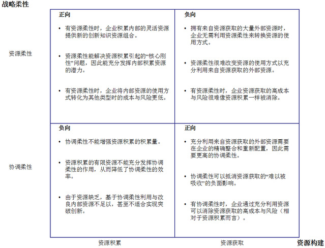 由于企业常常面临高度动态环境的挑战,战略柔性的价值在企业限制实现突破创新的内在风险与成本方面尤其重要。虽然资源柔性与协调柔性都与识别,配置和部署相关资源的风险,成本与时间相关,这两种柔性有各自的特殊关注视角。资源柔性更关注资源可用范围的技术属性,而协调柔性更关注在组织系统和流程中作为一个整体识别与配置资源禀赋组合的组织属性。