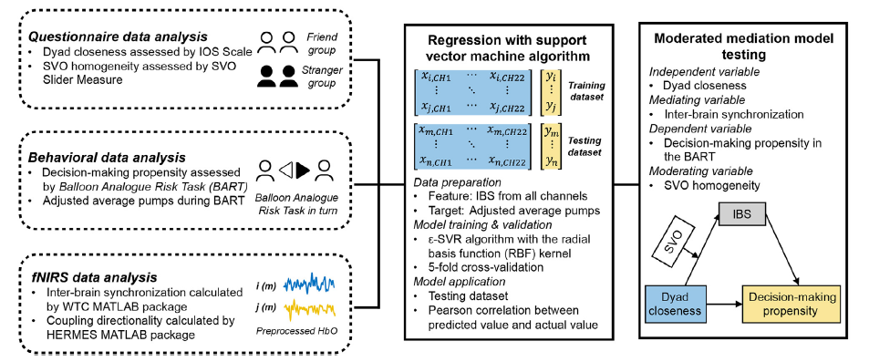 当人们在与处于不同关系中的同伴共同进行团体决策的过程中,随着受益人由个体转向团体,人们往往会表现出不同的决策倾向。该研究结合基于fNIRS的超扫描技术,采用经典的仿真气球冒险任务(Balloon Analogue Risk Task, BART)来考察社会关系影响双人动态风险决策的脑间神经机制。该研究揭示了处于不同社会关系中的被试小组完成团体决策时不同的脑间连接模式,并进一步表明朋友组被试加工负反馈结果时的脑间活动同步性可以预测双方随后的风险偏好倾向,而陌生组被试加工正反馈结果时的脑间活动同步性可以预测双方随后的风险偏好倾向。
